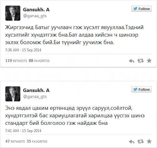 Зам тээврийн сайд асан А.Гансүх жиргээч Ц.Батыг уучилснаа өөрийн твиттер хуудсаараа мэдэгдсэн нь мөн л олны дунд хэрүүл, хэлцлийн алим шидсэн хэрэг болсон. Тэрбээр Ц.Батыг олон нийтийн мэдээллийн хэрэгслээр өөрийнх нь нэр хүндэд халдсан хэргээр шүүхэд гомдол гаргасан юм. Улмаар шүүхээс Ц.Батыг 100 хоног баривчлах ялаар шийтгэсэн ч нэг сар орчим 461-р хорих ангид хорьсны эцэст сулласан.