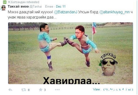 Жиргэх гэж бужигнуулдаг нөхөр бол Танхай эмээ. Твиттер гэж цахим ертөнцөд өөрийн гэсэн орон зайг хэдийнэ үүсгээд байгаа түүний бүтээлийг хүлээж суудаг хүмүүс цөөнгүй. Улс төрчдөд хоч өгч басхүү зураг эвлүүлэн элдвийг шоглож өөрийн имижийг бий болгосон түүний олон хоржоонтой жиргээнээс “хавирдаг” жиргээг онцолж байна.