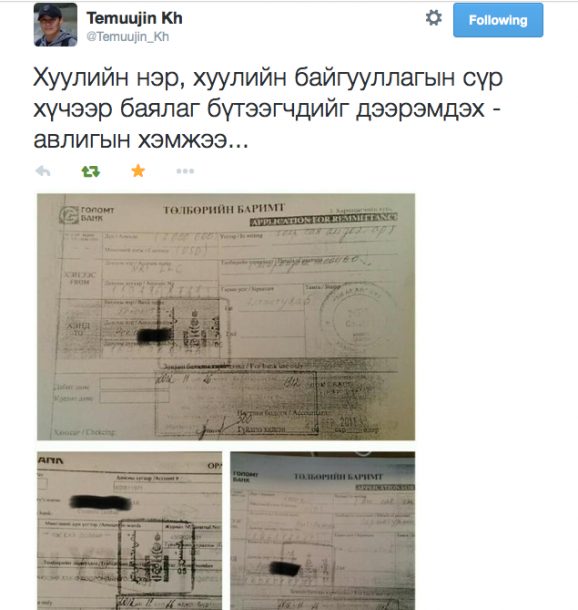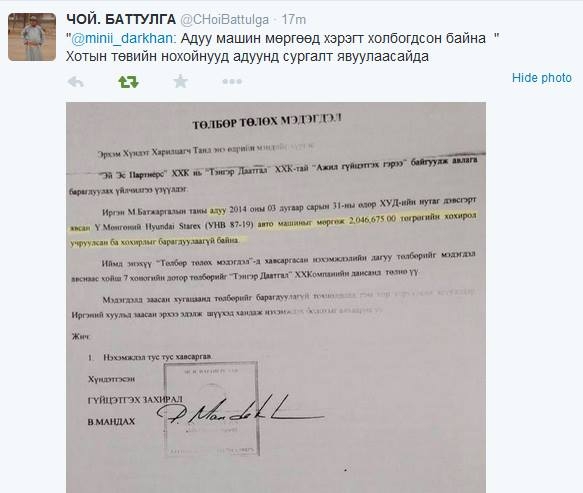 Хууль зүйн сайд асан, УИХ-ын гишүүн Х.Тэмүүжин твиттер хуудсаараа дамжуулан 4 сая ам.долларын авлигын маш ноцтой хэргийг дэлгэсэн нь шуугиан дэгдээв. Түүний энэ дэлгэсэн баримтад нэр холбогдсон талууд тайлбар өгөв. Харин хэргийн эзэн хэнгэргийн дохиур болсон Хууль зүйн сайд асан маань таг чиг. Энэ талаар тодруулга авах гэсэн сэтгүүлчдээс ум хумгүй зугтав. Түүний энэ байдал өөрийг нь сайдын суудлаа алдахаа хүрэхэд өс өвөрлөн ийм мэдээлэл тараасан арчаагүй амьтан болгон харагдуулав.