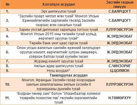 Өнөөдөр Засгийн газрын ээлжит хуралдаан 16:00 цагт болно. Тус хуралдаанаар нууцын зэрэглэлтэй асуудал байгаа бөгөөд дараах асуудлуудыг хэлэлцэх юм.