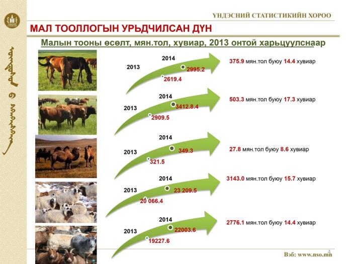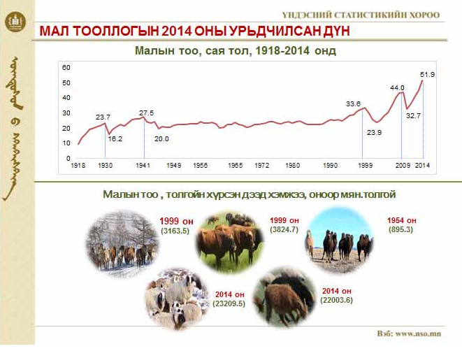 Мал тооллогын урьдчилсан дүнгээр 2014 оны жилийн эцэст манай улсын мал сүргийн нийт дүн 51970.4 мянган толгойд хүрчээ.