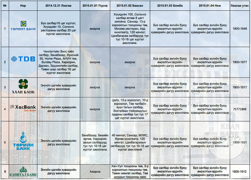 Өнөөдөр болон ирэх амралтын өдрүүдэд ажиллах банкуудын цагийн хуваарийн дэлгэрэнгүй мэдээллийг хүргэе.