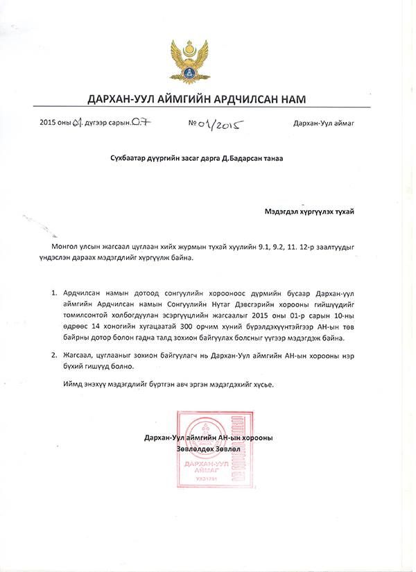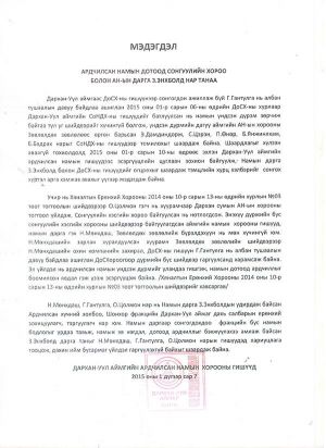Ардчилсан намын дарга З.Энхболдод Дархан-Уул аймгийн Ардчилсан намын гишүүдээс шаардлага хүргүүлсэн байна. Тэд Дархан-Уул аймгаас Дотоод сонгуулийн хорооны гишүүнээр сонгогдон ажиллаж байгаа Г.Гантулгыг албан тушаалынхаа давуу байдлаа ашиглан дотоод сонгуулийн хорооны хурлаар гишүүдийг батлуулсан. Энэ нь намын дүрэм зөрчиж байна. Иймд намын дарга уг шийдвэрийг хүчингүй болгож намын хорооны зөвлөлдөх зөвлөлөөс өргөн барьсан хүмүүсийг Дотоод хорооны гишүүнээр томилохыг шаардаж байна гэжээ. Мөн тэд энэ сарын 10-ны өдрөөс эхлэн 14 хоногийн хугацаатай нийт 300 орчим хүний бүрэлдэхүүнтэйгээр жагсаал зохион байгуулах аж. Уг жагсаалыг зохион байгуулах бичгээ Сүхбаатар дүүргийн Засаг дарга Д.Бадарсанд албан бичгээр хүргүүлжээ.