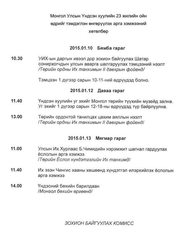 онгол Улсын Үндсэн хуулийн 23 жилийн ойн өдрийг тэмдэглэн өнгөрүүлэхээр болсон ба ойн өдрийн арга хэмжээний үйл ажиллагаа өнөөдрөөс эхэлж байгаа юм. Уг арга хэмжээний хөтөлбөрийг дэлгэрэнгүй танилцуулж байна.