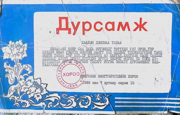 -Тиймээ, гурван өрөө орон сууц манайд өгсөн. Гэхдээ манайх аваагүй. Эмнэлгээс гараад байж байхад манай нөхөр цайны цагаараа ирээд “Нийтийн ахуйн үйлчилгээний газраас хоёр сая дахь иргэндээ гурван өрөө байр өгч байна. Байр авах уу” гэсээр ирсэн. Тэгэхээр нь би байр хүйтэн, аваад яахав дээ гэж хэлээд аваагүй. Нөхөр бид хоёр тухайн үеийн Ахуйн үйлчилгээнд хамт ажилладаг байсан юм. Түүнээс хойш 21 хоногийн дараа Эрүүл мэндийн Сайд П.Нямдаваа, Нийтийн ахуйн үйлчилгээний дарга Цэрэнхүү, Үйлдвэрчний зөвлөлийн дарга Баасанхүү, Залуучуудын эвлэлийн хорооны дарга Байгальмаа нар ирж хоёр сая дахь иргэний медаль гардуулсан. Хоёр сая дахь иргэний үе чацуутан 13 хүүхдийг хүлээн авч байсан. Манайх охиноо угждаг байсан юм. Аймгийн хүүхдийн сүүний газраас дугаарлуулахгүйгээр сүү өгч, ясли цэцэрлэг ховор байх үед саадгүй явуулж өгдөг байсан. Нийтийн ахуйн үйлчилгээний оёдлын бригадаас хоёр сая дахь иргэнийг халамжлан хүмүүжүүлэгч гэж хүн гаргаж өгч байлаа.