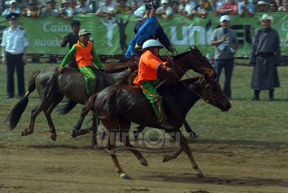 Морьдын туурайнаас туузрах ухаа бор тоос хүлгийн давхилыг гүйцэлгүй тэнгэрт угалзрахыг ажин их усны түрхрээ шиг чимээ алсаас нүргэлэхийг анирласан наадамчин олон өндөлзөн байх үес дурангийн хурц хараанд нэгэн бүгээн морь гарч ирлээ. Түүний араас өөр нэгэн бараан морь нэхэн нэхэн хурдална. Эгц дээшээ цойлон босох тоосноосоо зугтах мэт хурдлах энэ хоёр хүлэг бусдаас хол тасарчээ.