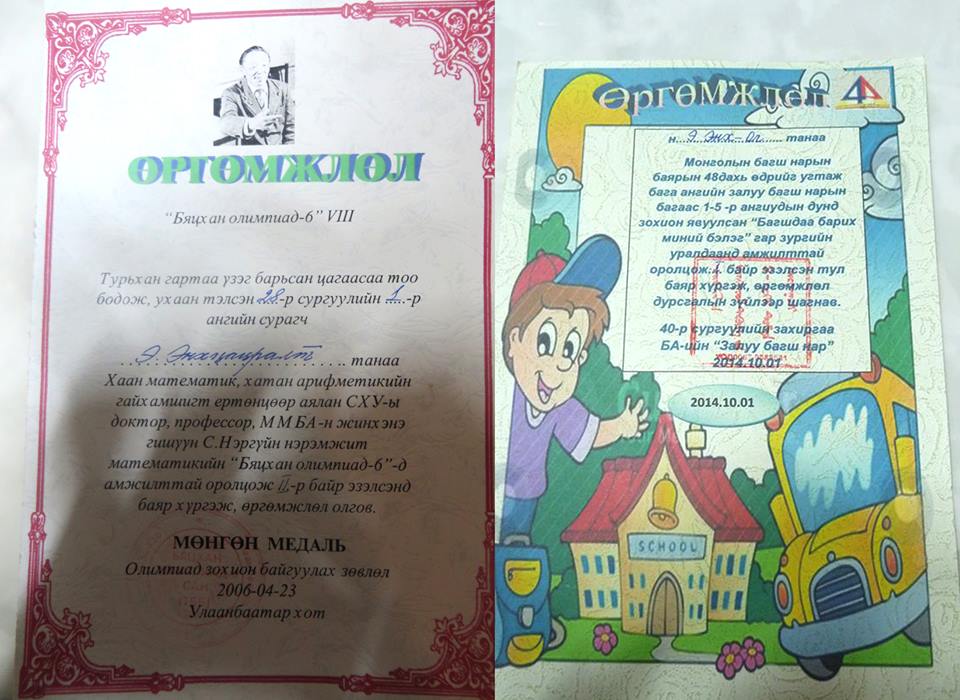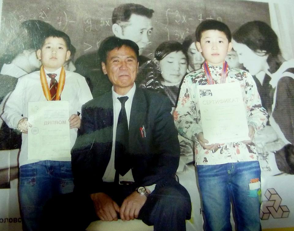 Болд багштайгаа. Болд багш нь түүнийг олимпиад энэ тэрд оруулаад байнга л дагуулаад явна. Амжилт гаргахгүй байх нь хамаагүй. Ямарч байсан олимпиадад ороод сурчих гэдэг байж. Тэрээр хоёрдугаар ангид байхдаа анх 93-р сургууль дээр олимпиадад ороод мөнгөн медаль авсан. Тэрнээс хойш жил болгон тасралтгүй медаль авсан гэнэ.
