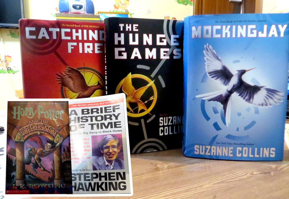 Энэ бол түүний номнууд. Кембрижийн шалгалтын хамгийн дээд оноог авсан хүүдээ ээж нь юу авч өгөх вэ гэхэд Сүзаань Колинзийн гурван ботийг авч өгөхийг хүсчээ. Харин Харри Портерт тэр маш дуртай. Бүх ботийг нь уншиж дуусгасан. Тэгвэл яг одоо өөрийнхөө шүтэн биширдэг Стефан Хавкины номыг уншиж байгаа гэнэ.