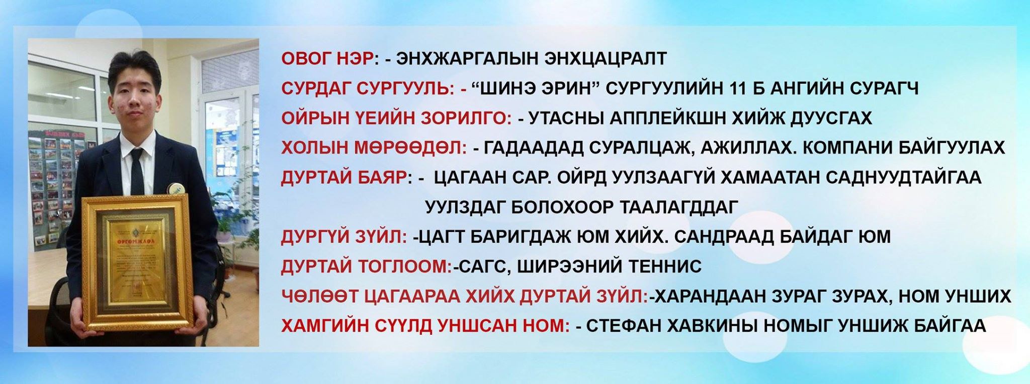 -Нэлээд хэцүү байсан шүү. Эрчимжүүлсэн сургалт их өгөөжөө өгсөн. Эрчимжүүлсэн сургалтад сууснаар англи хэлэндээ их гайгүй болсон. Одоо манай ихэнх хичээл англи хэл дээр явагддаг. Миний хувьд анх сургуульд орохдоо харьяаллын дагуу 28 дугаар сургуульд орж байлаа. Гэтэл хоёрдугаар ангид байхад ангийн багш маань жирэмсэний чөлөө аваад, хичээл жаахан цалгардаад эхэлсэн. Тиймээс ээж маань 40 дүгээр сургууль руу шилжүүлсэн юм. Тэнд Болд гэж багш байсан. Тэр багшийнхаа ачаар би математикт их сайн болсон. Тэнд суурь сайтай болсон болохоороо нэгдүгээр сургуульд шалгалт өгөхөд тэнцсэн. Нэгдүгээр сургуульд ороод Бат-Эрдэнэ гэж мундаг багшийнхаа удирдлагад математикаа гүнзгийрүүлэн суралцсан. Энэ бүхэн маань “Шинэ эрин” сургуульд ороход их нөлөөлж, өнөөдрийн энэ амжилтыг гаргахын үндэс болсон. Тиймээс Болд, Бат-Эрдэнэ багш нартаа баярлалаа гэж хэлмээр байна.