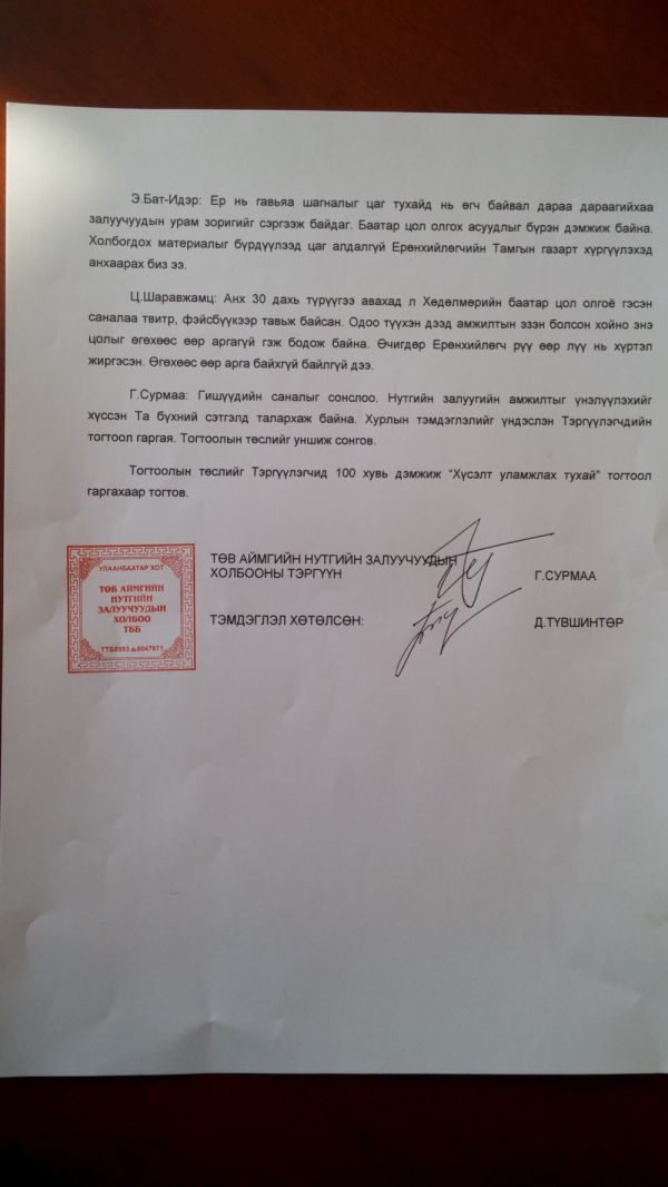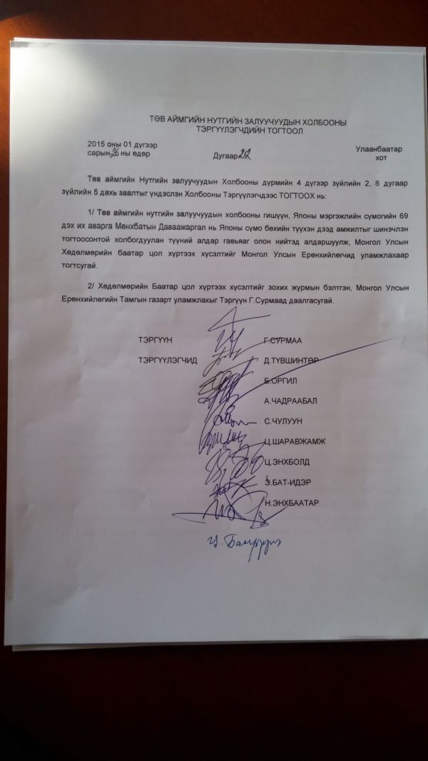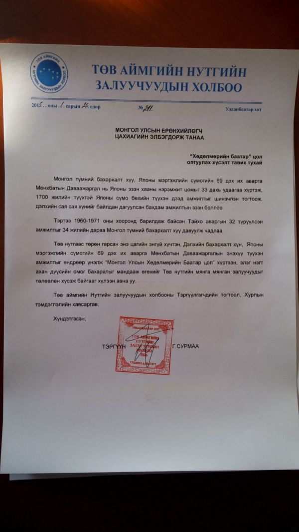 Төв нутгаас төрөн гарсан энэ цагийн энгүй хүчтэн, Дэлхийн бахархалт хүн, Японы мэргэжлийн сүмогийн 69 дэх их аварга Мөнхбатын Даваажаргалын энэхүү түүхэн амжилтыг төр засаг, түмэн олон өндрөөр үнэлж “Монгол Улсын Хөдөлмөрийн Баатар цол” хүртээн, элэг нэгт ахан дүүсийн омог бахархлыг мандааж өгөхийг Төв нутгийн мянга мянган залуучуудын өмнөөс “Төв аймгийн Нутгийн залуучуудын холбоо” уриалж байна.