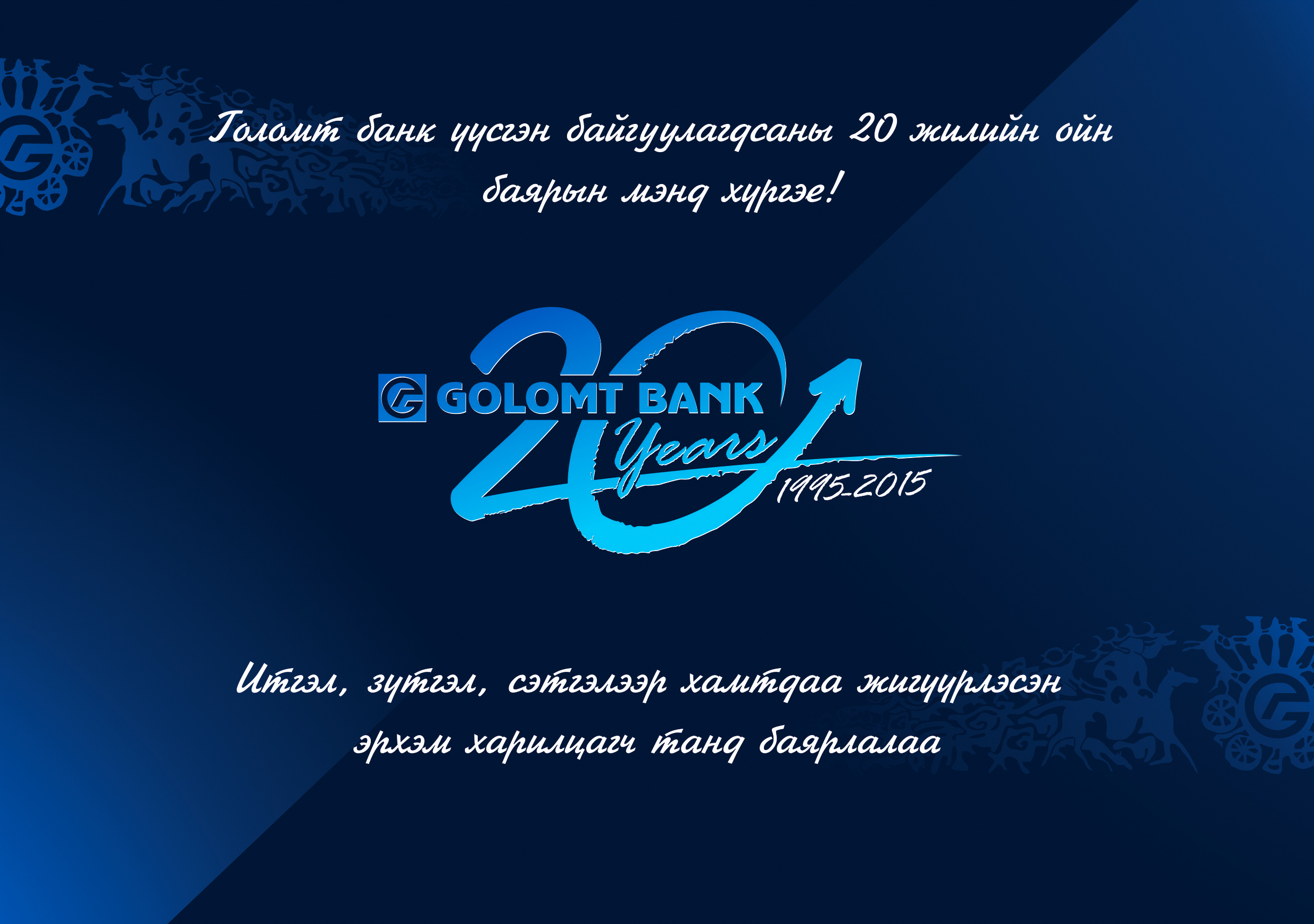 Эрхэм харилцагч танд Голомт банк үүсгэн байгуулагдсаны 20 жилийн ойн баярын мэндийг хүргэе!