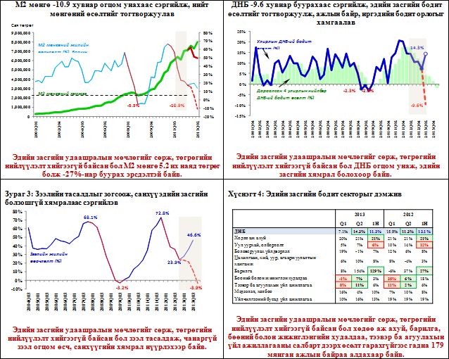2011-2012 оны дунджаар гадаадын шууд хөрөнгө оруулалт ДНБ-ий 40 гаруй хувийг эзэлж байсан бол 2013 онд 16 хувь, 2014 онд ердөө 3.4 хувьтай тэнцэх хэмжээнд хүрч огцом буурсан. Ийм хүндрэлтэй эдийн засгийн нөхцөлд Монголбанк, Засгийн газар хамтран гол нэрийн бараа бүтээгдэхүүний үнийг тогтворжуулах хөтөлбөрийг хэрэгжүүлсэн билээ. Энэхүү хөтөлбөрийн гол зорилго нь нийлүүлэлтийн гаралтай инфляцийг бууруулах, дунд хугацаанд бараа, бүтээгдэхүүний нийлүүлэлтийн тогтвортой тогтолцоог бүрдүүлэх, эдийн засгийг тогтворжуулах явдал байсан.