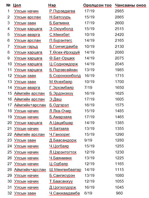 МҮБХ-ноос наадмаас наадмын хооронд болсон барилдаануудын үр дүнгээр чансаагаа тооцдог билээ. Өнгөрсөн жилийн наадмаас хойш өнөөдрийг хүртэл нийтдээ улсын цолтой бөхчүүдийн 19 барилдаан болсон байна. Энэхүү 19 барилдаанд үзүүлсэн амжилтад нь харгалзах оноог өгөхөд Архангай аймгийн Булган сумын харьяат, “Алдар” спорт хороо, “Бөх билэгт” дэвжээний бөх, улсын начин Рэнцэнбямбын Пүрэвдагва 2985 оноогоор тэргүүлж, өнгөрсөн наадмын түрүү бөх, улсын арслан Н.Батсуурь удаалж байна.