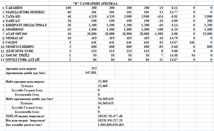 Нийт 37 үнэт цаас арилжсанаас 8 үнэт цаасны ханш өсч, 22 үнэт цаасны ханш буурч, 7 үнэт цаасны ханш тогтмол байлаа.