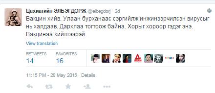 Монгол Улсын Ерөнхийлөгч Ц.Элбэгдорж Улаанбурхны халдвараас сэргийлэх вакцин хийлгэсэн тухайгаа өөрийн "Twitter" хуудсаанаа жиргэжээ.