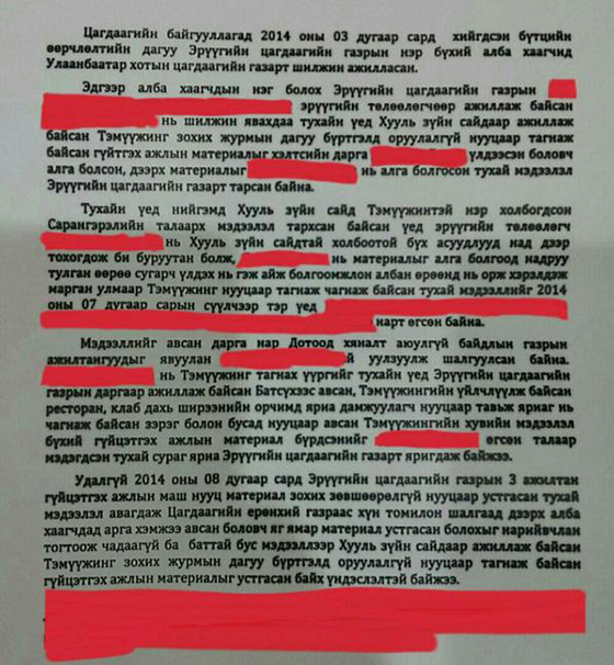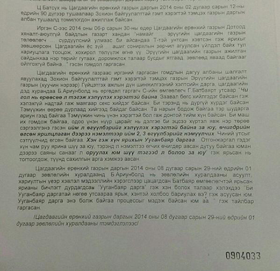Үүнд иргэн Г.Сарангэрэл гэх эмэгтэй 2014 оны 06 дугаар сарын 30-ны өдөр ЦЕГ-ын Дотоод хяналт, аюулгүй байдлын газарт хандаж, “…эрүүгийн цагдаагийн газрын төлөөлөгч … намайг сүрдүүлсний улмаас би айсандаа Т-тэй унтсан хэвтсэн гэж ярихыг зөвшөөрсөн. Энэ нь цагдаагийн ёс зүй, ашиг сонирхлын зөрчил агуулсан үйлдэл байх тул хариуцлага тооцож, хохирол төлүүлж өгнө үү. ЭЦГ-ын ажилтан яагаад сайдынхаа нэр төрийг гутаах, доромжлох талаар бусдыг ятгаад, зөвлөөд байгааг би ойлгохгүй байна” хэмээн гомдол гаргажээ.
