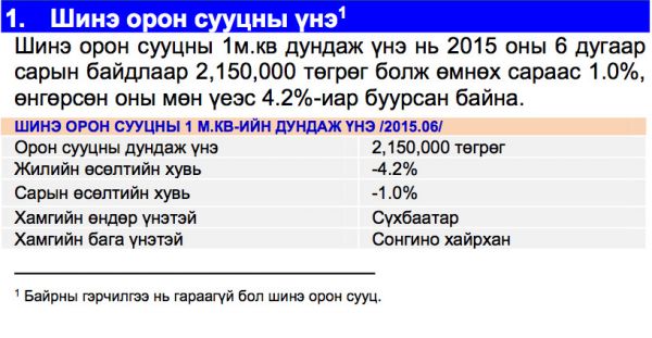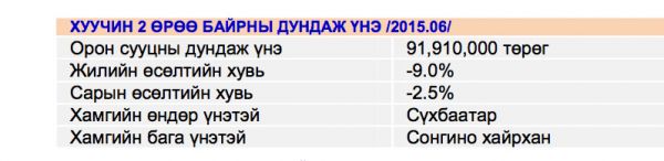 Үл хөдлөх хөрөнгийн Тэнхлэг зууч компани 2015 оны 06-р сарын “Орон сууцны үнийн индекс”-ийн (ОСҮИ) судалгааг танилцууллаа. Тус судалгаагаар ОСҮИ 06-р сард 14.0 хувьтай гарчээ. Энэ нь өмнөх сараас 2.37 хувиар, оны эхэн үетэй харьцуулахад -4.15 хувь, өнгөрсөн оны мөн үетэй харьцуулахад -8.4 хувиар буурсан үзүүлэлт юм.