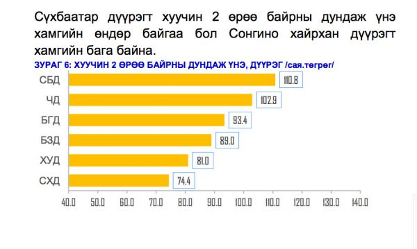 Хуучин 2 өрөө байрны дундаж үнэ өнгөрсөн сарын сарын байдлаар 91,910,000 төгрөг болжээ. Энэ нь өмнөх сараас 2.5 хувиар, өнгөрсөн оны мөн үеэс 9.0 хувиар тус тус буурсан үзүүлэлт юм.