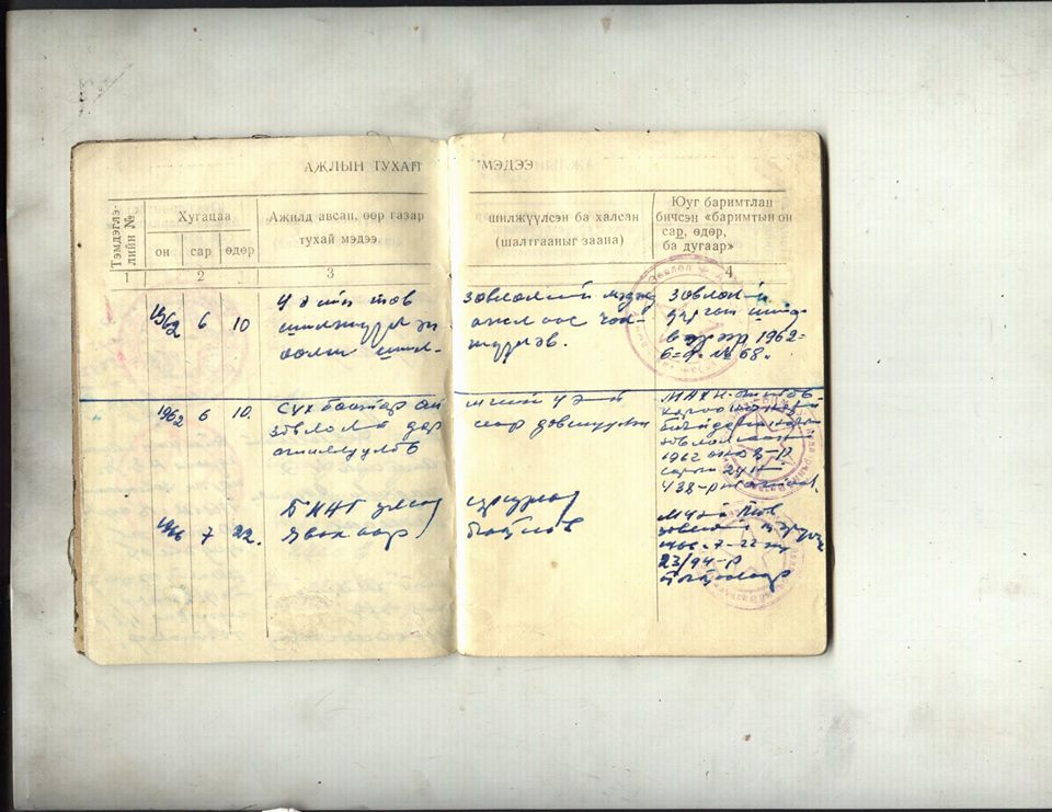 1966 оны 7 сарын 22-нд Германд сургуульд явуулахаар томилов гэсэн Монголын Үйлдвэрчний эвлэлийн Төв зөвлөлийн шийдвэр бүхий тамгатай Хөдөлмөрийн дэвтэр нь