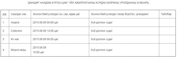 Даншиг наадмын бөх, морь, сурын бай шагнал нь улсын наадмын байтай адил бөгөөд даншигт эрлийз морьдыг уралдуулахгүй юм байна. Наадамд уралдах морьдын бүртгэлийг 2015 оны 8 дугаар сарын 07-ны өдөр “Хүй долоон худаг”—т зохион байгуулахаар болжээ.