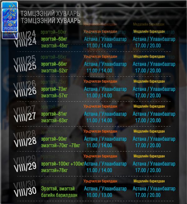 Жүдогийн насанд хүрэгчдийн дэлхийн аварга шалгаруулах тэмцээн эхлэхэд хэдхэн хоног үлдлээ. Тодруулбал 2016 оны олимпийн өмнөх отгон дэлхийн аварга наймдугаар сарын 24-нд Казахстаны нийслэл Астана хотод эхэлнэ.