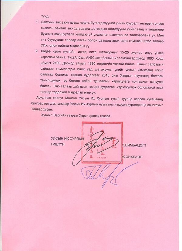 УИХ-ын гишүүн С.Бямбацогт, Ж.Энхбаяр нар шатахууны үнийн талаар Уул уурхайн сайд Р.Жигжидэд асуулга тавьж, үнийг бууруулах талаар тодорхой арга хэмжээ авахыг шаардлаа. Учир нь 2014 оны тавдугаар сард дэлхийн зах зээл дээр нэг баррель нь 112 ам.долларт хүрсэн газрын тосны үнэ тогтмол буурсаар 2015 оны нэгдүгээр сард 63 ам.доллар, өнөөдөр 42 ам.доллар болоод байна. Иймд дэлхийн зах зээл дээр үнэ нь гурав дахин буурсан нефть бүтээгдэхүүнтэй холбогдуулан манай дотоодын зах зээлийн үнийг ганц ч төгрөгөөр буулгах зохицуулалт хийгдэхгүй байгаагийн үндэслэл шалтгааныг тайлбарлаж, УИХ, олон нийтэд мэдээлэхийг Уул уурхайн сайдаас хүссэн байна.