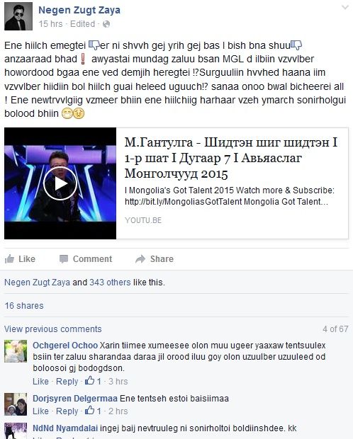 Өнгөрөгч сараас эхлэн “Монгол” HD телевизээр “Авъяаслаг Монголчууд” шоу нэвтрүүлэг албан ёсны эрхтэйгээр гарах болсон. Монгол бахархлыг дэлхийд таниулах зорилготой уг шоу нэвтрүүлэг гарсан цагаасаа эхлэн үзэгчдийн сайшаал, талархал, шүүмжлэлийг зэрэг зэрэг хүртээд байгаа. Тэгвэл өчигдрийн дугаарт гарсан “илбэчин” залуугийн үзүүлбэр олон үзэгчидэд таалагдсан хэдий ч шоуны шүүгч хийлч Дээгий түүнийг дэмжээгүйгээр олон олон хүний эгдүүцлийг хүргээд авсан. Тэгвэл илбэчин залуугийн талаар Нэгэн зүгт хамтлагийн дуучин Заяа өөрийн сэтгэгдлээ цахим хуудсаар дамжуулан илэрхийлсэн байна. Уран бүтээлч залуу маань энэ удаад үнэхээр бухимджээ. Тэрээр “Энэ хийлч эмэгтэй ер нь шүүх гэж, ярих гэж бас л биш байна шүү. Анзаараад байхад авъяастай мундаг залуу байсан. Монголд илбийн үзүүлбэр ховордоод байгаа энэ үед дэмжих хэрэгтэй! Сургуулийн хүүхэд хаана ийм үзүүлбэр хийдийн бол хийлч гуай хэлээд өгөөч? Санаа оноо байвал бичээрэй! Энэ нэвтрүүлгийг үзмээр байхын. Энэ хийлчийг харахаар үзэх ямар ч сонирхолгүй болоод байхын” хэмээн хийлч Дээгийг ширүүхэн шүүмжлээд авлаа. Түүний бичсэн сэтгэгдлийг ч олон арван хүн дэмжиж сэтгэгдлээ хуваалцсан байна. Цахим ертөнцөд ингэж сэтгэгдлээ хуваалцаж байхыг бодоход дуучин Заяа аргагүй их бухимдсан бололтой.