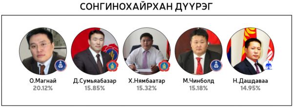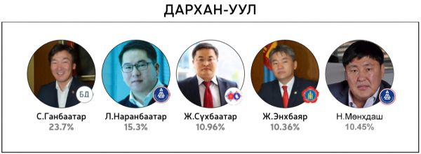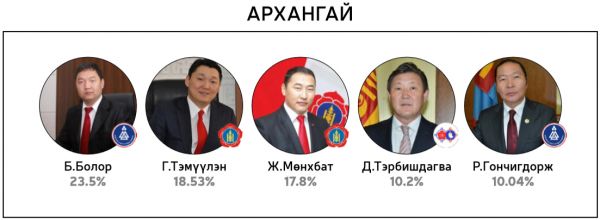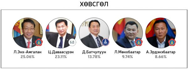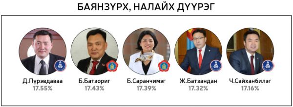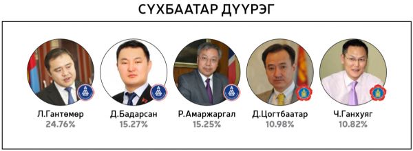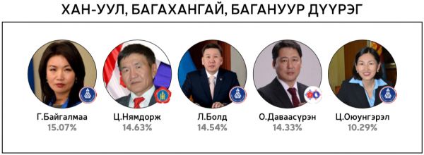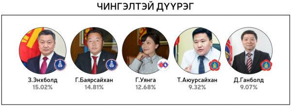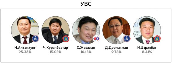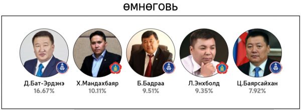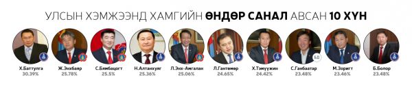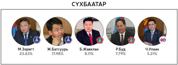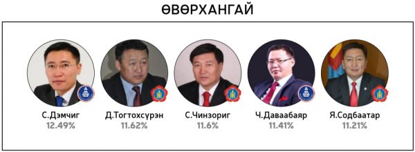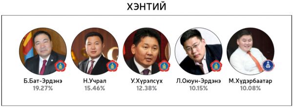 Нийт 60 хоногийн хугацаанд 300 гаруй горилогчдын дундаас 14144 хүний саналаар тодруулсан “Миний сонгох-76” шалгаруулалтад хамгийн олон санал авсан 10 топ улс төрч болон УИХ-ын 26 тойрогт нэр дэвшихээр горилогчдоос олон саналтай таван улс төрчдийг авсан саналын хувиар нь жагсаасныг ийнхүү хүргэж байна.