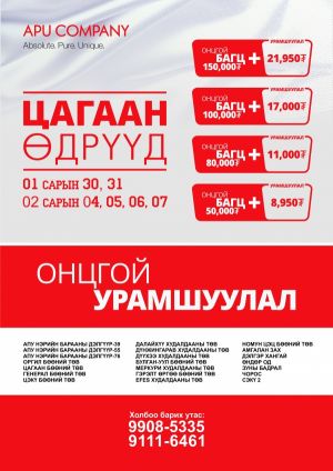Эрхэм хэрэглэгч та бүхэн Үндэсний манлай үйлдвэрлэгч АПУ компанийн бүтээгдэхүүнүүдийн ҮЙЛДВЭРИЙН ҮНЭЭР худалдан аваад дээрээс нь олон нэр төрлийн бүтээгдэхүүний НЭМЭЛТ УРАМШУУЛАЛ авах “ЦАГААН ӨДРҮҮД” өргөтгөсөн худалдаагаар үйлчлүүлээрэй.
