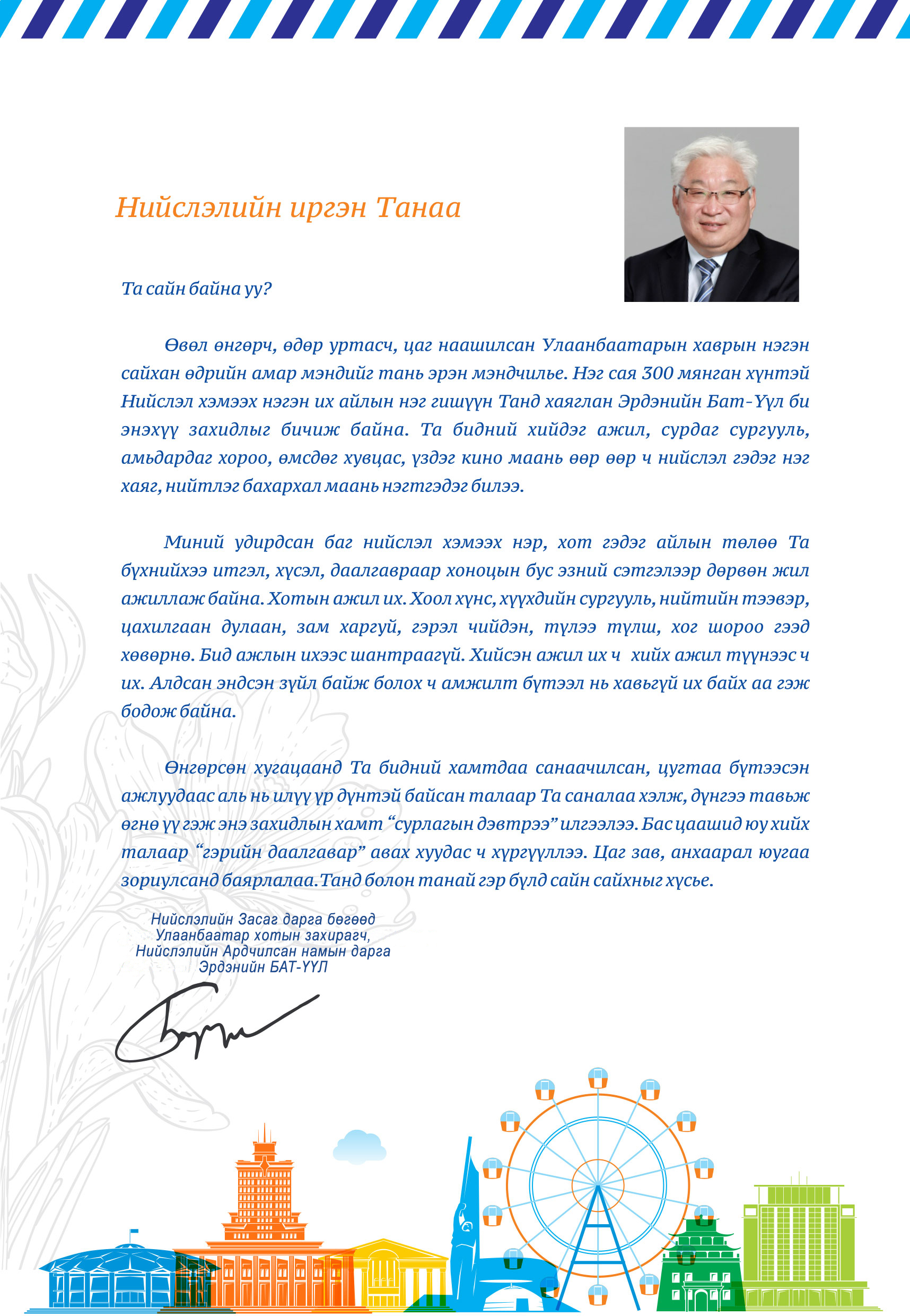 Дөрөвхөн жилд юу хийж, юуг бүтээж, ямар өөрчлөлт гаргаж болдгийг Бат-үүл дарга та харуулж чадсан. Хийж байгаа нь ил, хэлж байгаа нь шулуун шударга, иргэдээсээ бас хэт их асуудаг тань магад таныг муулах, өөчлөх хүмүүст олз болсон байхыг үгүйсгэхгүй байна. Үнэхээр нийслэлчүүд АН-ыг, таны багийг дэмжсэндээ харамсахааргүй жилүүдийг өнгөрөөлөө. Танд амжилт хүсье. Ажлын төлөө гэсэн чинь сэтгэлтэй хүний үг, үйл нь хүртэл сэтгэлээсээ байдаг гэдгийг таны захидлыг уншаад ухаарлаа. Дэмжинээ, амжилт