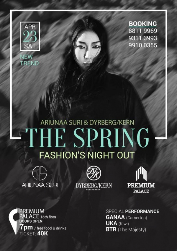 4-р сарын 23-ны Бямба гарагт "THE SPRING fashion’s night out" нэртэй нэгэн онцгой үдэш болох юм. ARIUNAA SURI брэнд үндэсний уламжлалт хувцасны элементийг шингээсэн өдөр тутмын спортлог чөлөөт загваруудаа Дани улсын гоёл чимэглэлийн DYRBERG/KERN брэндийн бүтээгдэхүүнүүдтэй хослуулан толилуулна. Энэ удаагийн шоунд Топ модель Урнаа болон бусад шилдэг моделиуд оролцож загвар үзүүлэх юм байна.