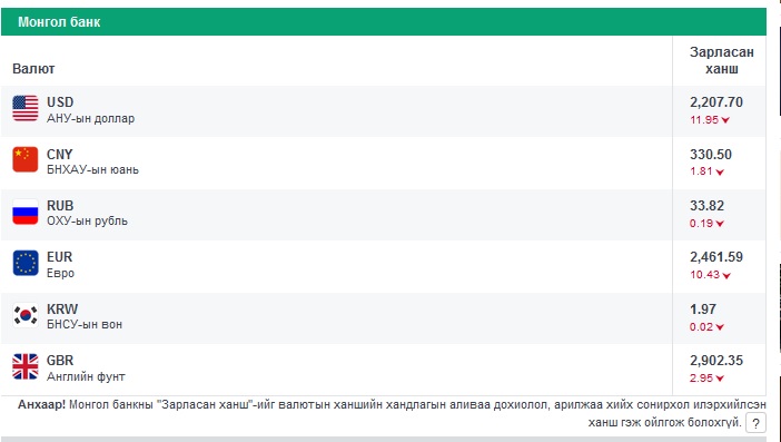 Монголбанкны өнөөдрийн зарласан ханшаар нэг ам.доллар 2207 төгрөг 7 мөнгөтэй тэнцэж байна. Харин “Найман шарга” валют арилжааны төвд ам.долларыг 2180 төгрөгөөр худалдан авч, 2220 төгрөгөөр арилжиж байгаа юм байна. Мөн манай улсын голлох валют болох БНХАУ-ын юань 330 төгрөгтэй тэнцэж, ОХУ-ын рубль 33 төгрөг 82 мөнгөтэй тэнцэж байна.