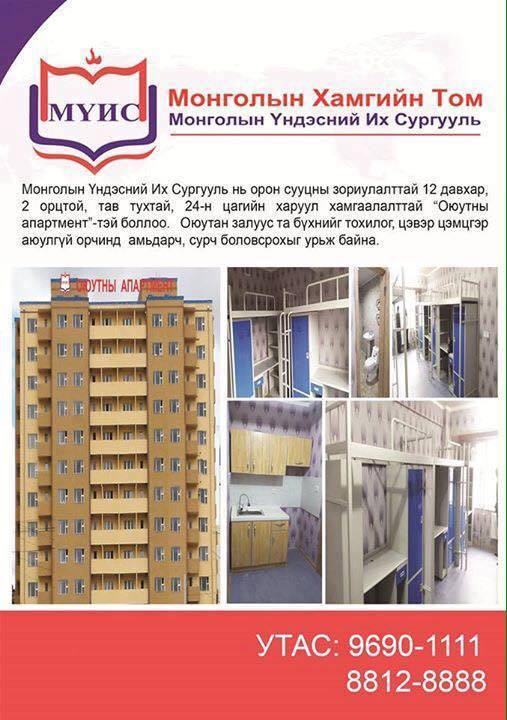 Монголын хамгийн том их сургууль-Монголын Үндэсний Их Сургууль нь боловсролын салбарт анх удаа оюутнуудын амьдрах орчинг 2 орцтой, 12 давхар, тохилог орон сууц хэлбэрээр шийдсэн 1000 оюутан хүлээн авах хүчин чадалтай, 24 цагийн харуул хамгаалалт бүхий тус байрандаа оюутан суралцагчдыг бүртгэж байгаа юм байна. Бусад их, дээд сургуулиудын орохыг хүссэн оюутан залуусыг тохилог, аюулгүй орчинд сурч, амьдрахыг урьж байгааг дуулгахад таатай байна. Мэдээллийг лавлах утас: 96901111, 88128888 гэдгийг тодотгон хэлье. Дашрамд өгүүлэхэд, Монголын хамгийн том их сургууль-Монголын Үндэсний Их Сургууль нь боловсролын салбарт өөрийн орон зайгаа бодитойгоор бий болгож, үнэтэй их хөрөнгө оруулалтыг хийж, чадварлаг боловсон хүчнийг бэлтгэж ирсэн манлайлагч сургууль билээ. Тэрчлэн эрдэмд шамдаж, сурч боловсроход залуусын хувьд орчин нөхцөл хамгийн чухал гэдгийг сайн мэдэх тул, 1000 оюутан хүлээж авах тохилог байрыг барьж, босгожээ.