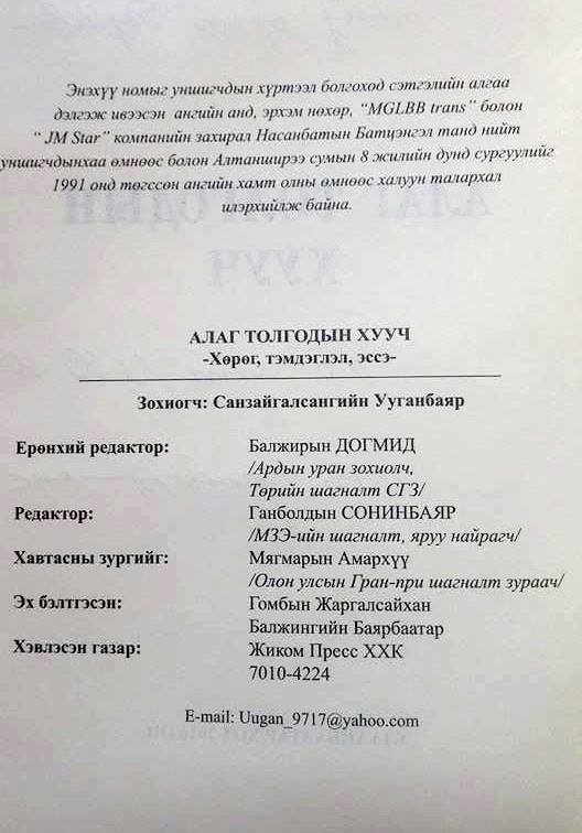 Гэвч Монголын ард түмэн хэзээнээсээ оюунлаг болохоор арга эв нь олдоод л байдаг юм... Энэхүү номыг уншигчдын хүртээл болгоход сэтгэлийн алгаа дэлгэсэн ангийн анд, "MGLBB" болон " JM STAR" компанийн захирал Насанбатын Батцэнгэлд уншигчдынхаа өмнөөс халуун талархал илэрхийлж байна. Н.Батцэнгэл маань алс АНУ-д ажиллаж амьдарч байгаа билээ.