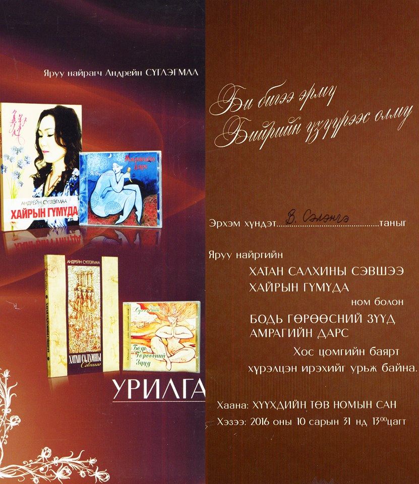 Ерөөл билэг нь тэгширсэн энэ сайхан урт шаргал намрын өдөр уншигч олон та бүхнийгээ, дуу хуурын нутаг Дундговь аймгаас төрөн гарч буй авьяас билэгт залуу яруу найрагч А.Сүглэгмаагийн “ХАЙРЫН ГҮМҮДА” “ХАТАН САЛХИНЫ СЭВШЭЭ” гэсэн хос номтой, танилцуулж байгаадаа баяртай байна. “ХАЙРЫН ГҮМҮДА” номын өмнөтгөлийг алдарт сэтгүүлч, зохиолч Б.Ойдов маань бичсэн байна. Тэрээр “Удган модны жимсэнд нэрсэн янаг хайрын гүмүда” хэмээн дуун алдах зууртаа, цэл залуугаараа үг хэл найруулга нь цэгцэрчихсэн ийм нэгэн авьяаслаг бүсгүй Монголын яруу найрагт омог бардам хөл тавьж байна. Бонус, канон, лизинг, шок, люкс, хаус, оффис гэх мэтийн харь үгээр харилцаж, монгол үгээ ч зүгээр хэлчихэж чадахгүй “Зогсожийна. Явжийна” гэх болсон чамирхал дийлсэн өнөө цагт эртний сайхан монгол үгээ орчин цагийн хэмнэлд тохируулж, үнэнхүү бадам аялгуулан дуурсгаж буй А,Сүглэгмаад уншигч бүхний өмнөөс талархъя. Ёстой л удган модны жимсэнд нэрсэн янагийн дарс лугаа.. хэмээсэн бол “ХАТАН САЛХИНЫ СЭВШЭЭ” номонд нь МУСГЗ До.Цэнджав ах маань бичихдээ “Шүлэг минь” шүлэгтээ өөрийнхөө философийг: