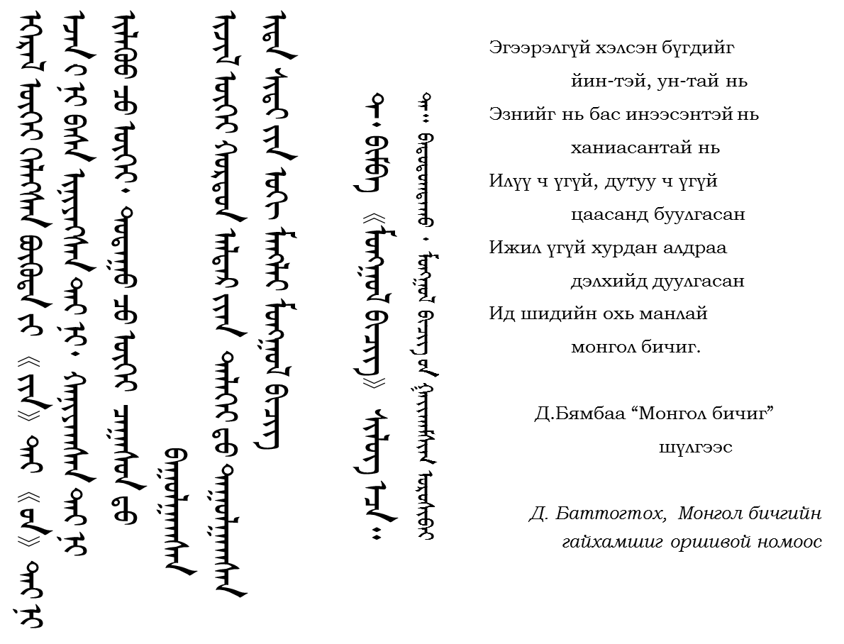 Энэ бичгийн тухай эдvгээ эрдэмтэн мэргэд маргах ч vндэсгvй, матах ч мөчиргvй болтлоо өмнө нь өвдөг сөхөрч, өлмийд нь тэргvvн бөхийж язгуур гарваль нь яах аргагvй Монгол гээд мэхийж байна. Морин дэл дээр ч бичиж болдог, мордох зуураа ч ацагладаг, судар гэж бооход ч босоо байдаг, сунтаг гээд мөргөхөд ч босохоос аргагvй болгодог, даян дэлхийн олон хэлтний хөндлөн бичиг шиг хэлтгий биш, дайн тулаан, алив бvхэнд урвамтгай бус, давхил сайтай морь шиг даанч гvйцэгдэшгvй ураг бичиг. Энэ бол миний Монголын бахархал. Дайны тvйрэн гэгдэж явсан Чингис хаан "Даяарчлалын эцэг" гэгдэх болсон өнөө цаг дор хөндлөн сэтгэдэг хvмvvний "хаад"-ын хvслийг нь гvйцээх бичиг биш болой. Өчиг бас биш болой. Хэвтээ сэтгэлгээтэй улсаас хол явахыг босоо сэтгэлээсээ Чингис хаан ухаарч анх удаа төрийн бичиг болгожээ. Монгол босоо бичиг минь бидний нэгэн бахархал буюу. Vнэн төр байж. Туургат бор гэрийн хананы нvднээс зуурч, цуургат хар гэрийн хатавчнаас зууралдаж, хvvе гэх завгvй хvvгээ төрvvлж, хvнд очих замдаа олзлогдож, харцаас зарц, зарцаас хаан болох ухааныг өvлэн эхээс Бөртэ vжин хvртэл, тулгар явах бvртээ тусгаар улсаа гэсэн vлгэрийн хэллэгээр "атга нөж"-тэй, vнэний хэлээр "атга зvрхтэй" Монголчуудын ураг, удмыг авч явах хувьтай тулгар эхчvvд л тулгар төр байгуулсан гавьяатай. Чингис нэрийг аваагvй Тэмvvжинг хэн хvн болгосон бэ? Тэнгис далай гаталгасан хаан болгосон бэ? Тулгар төрийг тулгуурыг бий болгосон Их Монгол улсыг тунхаглан зарласан Тэмvжин бас нэгэн гайхамшиг-Монголын бахархал. Он цагийг дурдах юун. Ойлгох ухаан хойч vед минь vлдэх болтугай.