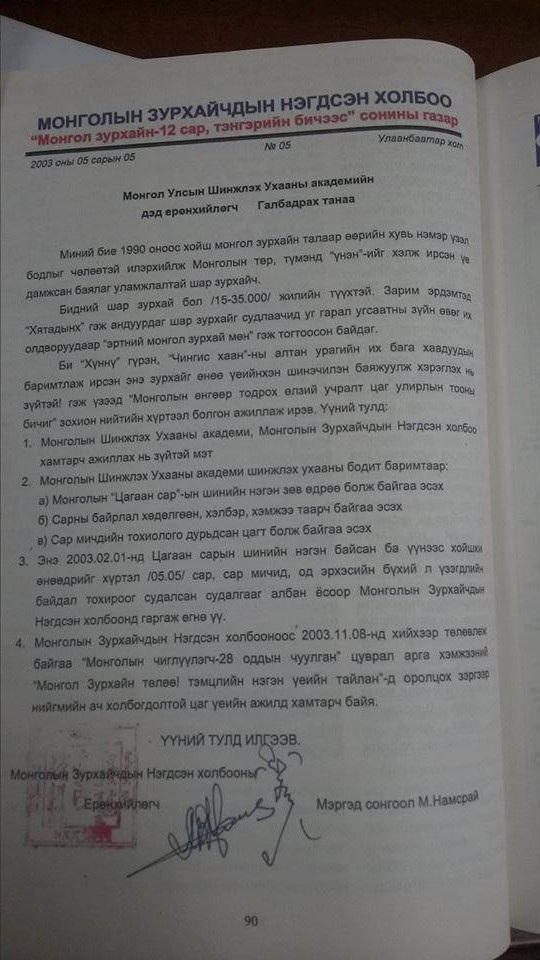 - Анхандаа хүмүүс таатай хүлээж аваагүй. ШУА-аас надад материал гаргаж өгөөч гэж хүсэлтийн тавдугаар сарын таванд өгсөн байхад хариу материалыг нэхүүлсээр зургадугаар сарын 11-нд өгсөн. Сар гаруй хүлээлгэсэн. Мөн 2004 онд Н.Багабандид 13 хуудас баримт, албан бичиг хүргүүлж байсан. Бас л өөрийн онол, гадаад дотоодын эрдэмтэн мэргэдийн онол, өөрийн шар зурхайн тухай үзэл, Хубилай хааны зарлиг гэх мэт зүйлийг өгсөн. Тэгээд энэхүү асуудлыг хэлэлцэн Засгийн газрын хуралдаанаар орсон боловч бүгд нутаг нугаараа хуйвалдаад, хурлын тэмдэглэл хийсэн болоод орхисон. Би “Та нар энэ асуудлыг яаралтай шийдэж өгч, нэг шийдэлд хүрэн ард түмэнд ойлгомжтой болгож өгөөч” гэсэн. Гэтэл өдийг хүртэл шийдэж өгөөгүй.