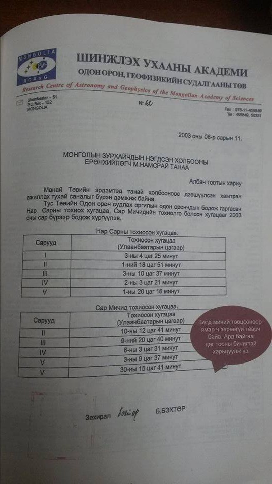 Манай оронд одон оронч эрдэмтэн байхгүй юмаа даа? Түүнээс биш хаврын тэргүүн сарын шинийн нэгэн хэзээ тохиохыг ТВ-н камерийн өмнө нотлоод хэнийх нь үнэн зөвийг амархан л үнэн зөвөөр шударга тогтоочихож болмоор юм?ШУА-ын эрдэмтэн гэгдэж буй эрхмүүд яагаад хуйвалдаж буй юм шиг таг дуугай суугаа нь ч сонирхолтой юм? Монгол түмнийг буруу өдөр золгуулж доройтуулах сонирхол хэнд байгаа юм болоо?Хэдэн жилийн өмнө нэг ТВ -ээр одон орны газраас үзүүлж байснаар бол шар гэгдэх зурхай нь эрдэмтэдийн гаргасантай таарч л байсан шүү?Анхааралдаа авахгүй бол Монгол түмэн уруудсаар л байх нь байна шүү ?