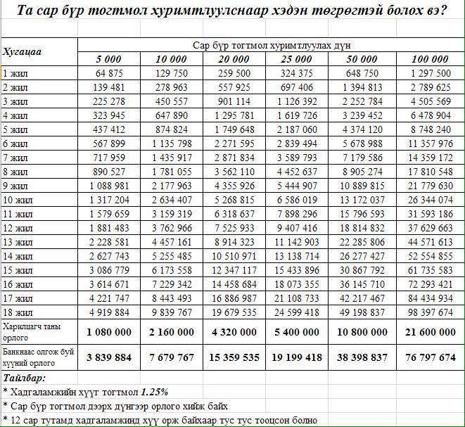 Доорх хүснэгтээс та сар бүр тогтмол хуримтлал бий болгосноор хэдэн төгрөгтэй болох боломжтойг харна уу?