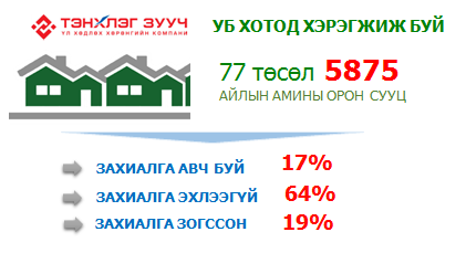 Улаанбаатар хотод хэрэгжиж буй 77 төслийн 5875 айлын амины орон сууц баригдаж байна. Үүний 17 хувь нь захилга авч байгаа бол 64 хувь нь захиалга эхлээгүй байгаа бол 19 хувь захиалга зогссон байна.