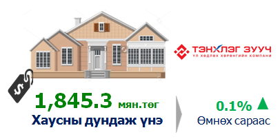 Хаусны дундаж үнэ 1.845 мянган төгрөг байна. Энэ нь өмнөх сараас 0.1 хувийн өсөлттэй гарсан үзүүлэлт юм.