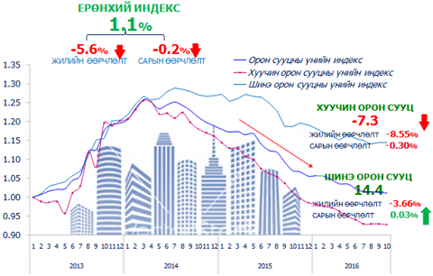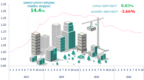 Тус компанийн хараат бусаар хийсэн "Орон сууцны үнийн индекс"-ийн судалгаанаас харахад өнгөрсөн 10-р сард орон сууцны үнийн ерөнхий индекс суурь үе буюу 2013 оны 1-р сараас 1,1 хувийн өсөлттэй гарсан нь өмнөх сараас 0,16 хувиар буурсан үзүүлэлт юм.