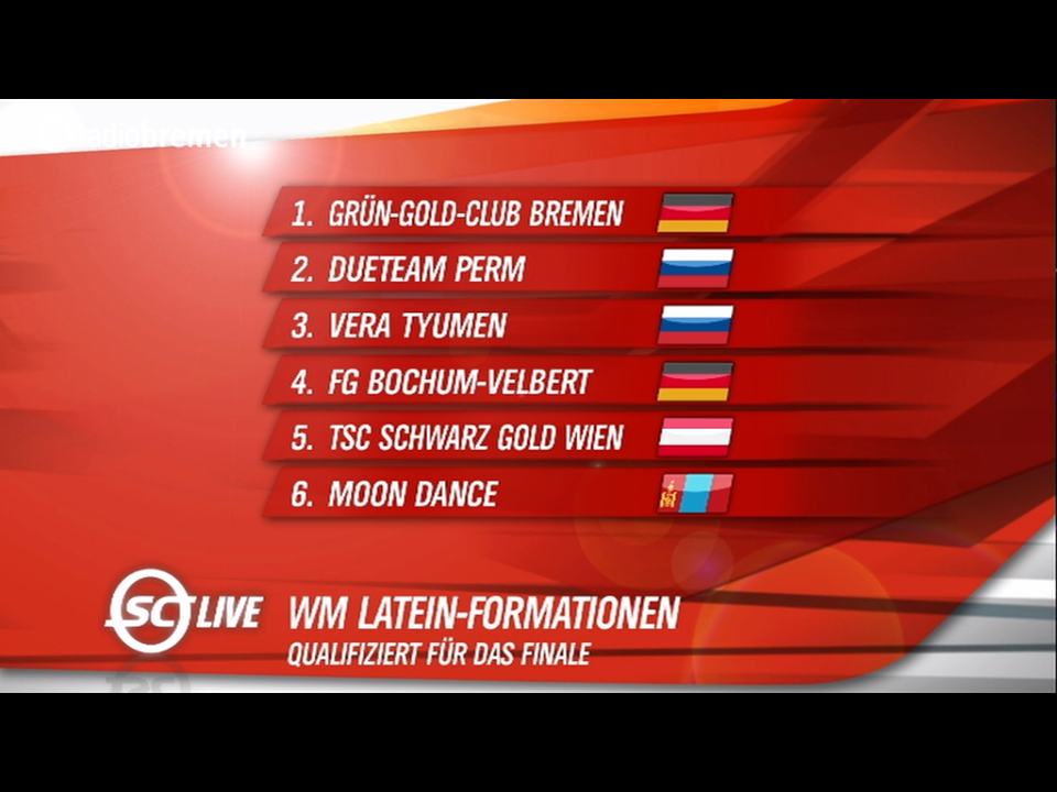 Тэмцээний нэг, дөрөвдүгээр байрт Германы баг, хоёр гуравдугаар байрт ОХУ-ын баг тус тус шалгарсан байна. Манай бүжигчдийг хувьд Дэлхийн аварга шалгаруулах тэмцээний финалийн шатанд үлдсэн шилдэг анхны Ази хамтлаг болсон юм.