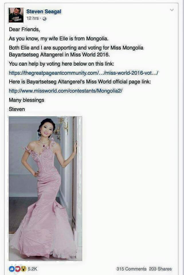 Монгол эмэгтэйтэй гэр бүл болсон Холливудын алдарт жүжигчин Стивен Сигал өөрийн фэйсбүүк хуудсаараа дамжуулан “Дэлхийн мисс” тэмцээнд Монгол Улсыг төлөөлөн оролцож байгаа А.Баярцэцэгийг дэмжихийг уриалсан байна.