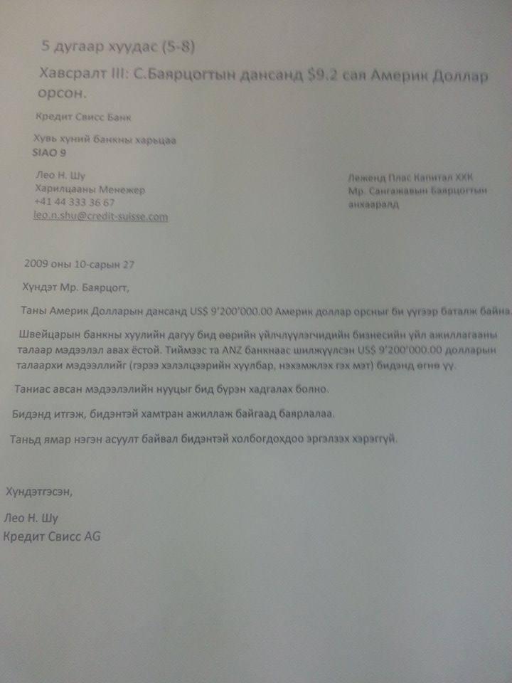 Тэдний өгч буй мэдээллээр өнөөгийн байдлаар С.Баярцогтын дансанд 2009 оны аравдугаар сарын 27-ны өдөр орсон 9.2 ам.доллар байгаа бөгөөд энэ нь Швейцарийн "Credit Suisse" банкнаас илгээсэн мөнгөний эх сурвалжийг баталгаажуулах хүсэлтээр нотлогдож байгаа аж.