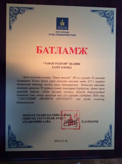 Уул уурхай, хүнд үйлдвэрийн яам, Ашигт малтмал газрын тосны газар, Уул уурхайн мэргэжлийн холбоодын зөвлөлөөс уул уурхайн салбарын шилдэгүүдээ шалгарууллаа. Уул уурхайн салбарын “Тэргүүний хөрөнгө оруулагч” аж ахуйн нэгжээр Орон нутгийн өмчит “Тавантолгой” ХК-ийг шалгаруулсан байна. Тус компани нь сүүлийн жилүүдэд улс болон орон нутгийн төсөвт 423,1 тэрбум төгрөгийн татвар, ноогдол ашиг төвлөрүүлж, Өмнөговь аймгийн төсвийн орлогын 70 хүртэлх хувийг дангаараа бүрдүүлж, аймаг орон нутгийн нийгэм, эдийн засгийн хөгжил, бүтээн байгуулалтад бодитой хувь нэмэр оруулсан тул уул уурхайн салбарын 2016 оны “Тэргүүний хөрөнгө оруулагч” аж ахуйн нэгжээр батламжилжээ.