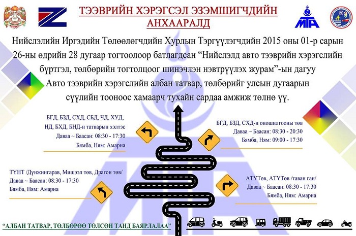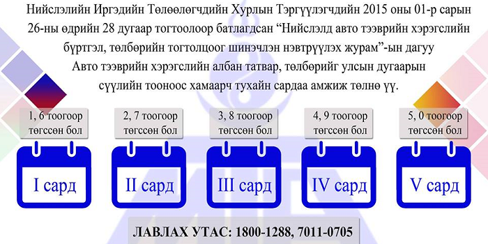 “Нийслэлд авто тээврийн хэрэгслийн бүртгэл, төлбөрийн тогтолцоог шинэчлэн нэвтрүүлэх журам”-ын дагуу авто тээврийн хэрэгслийн албан татвар, төлбөрийг улсын дугаарын сүүлийн тооноос хамаарч тухайн сардаа амжиж төлнө үү. Нийслэлд бүртгэлтэй бүх төрлийн авто тээврийн хэрэгсэлийн албан татвар, төлбөр хураах ажлыг 2017 оны нэгдүгээр сарын 9-нөөс тавдугаар сарын 31-ныг хүртэл зохион байгуулахаар болоод байна.