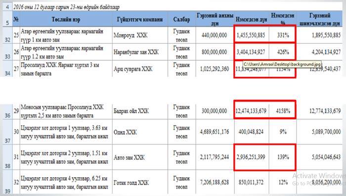 Ингэж хууль зөрчсөн шийдвэр гаргахын хажуугаар санхүүжилт олгож буй төслүүдийн өртөг их хэмжээгээр үндэслэлгүйгээр өссөн нь хөрөнгө мөнгө, шамшигдуулсан байх магадлалтай гэнэ. Тухайлбал улсын төсвөөс эргэн төлөгдөх нөхцөлтэйгөөр хийгдсэн Атар Өргөөгийн уулзвараас Яармагийн гүүр хүртлэх 1 км зам барих ажлыг “Монроуд” компани авчээ. Анх 440 сая төгрөгөөр гэрээ хийсэн тус замын ажил явцдаа нэмэгдэж 1 тэрбум 895 сая 550 мянган төгрөг болсон байна. Анхны үнээсээ 4 дахин өртөг нь нэмэгдсэн хэрэг. Ямар нь ингэж хийх ажлынхаа хөлсийг үндэслэлгүйгээр дөрөв дахин нэмээд авчихав гээд харахаар “Монроуд” хэний компани билээ. Тухайн үеийн УИХ-ын Эдийн засгийн байнгын хорооны дарга Б.Гарамгайбаатарын компани гэдгийг хэн бүхэн мэднэ.
