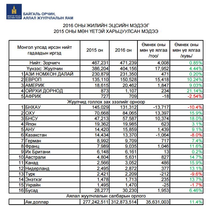 Гадаадын иргэн харьяатын газраас мэдээлснээр 2016 оны жилийн эцсийн байдлаар нийт зорчигчдын тоо 4008-аар буюу 0,85 хувиар өсжээ. Үүнээс жуулчдын тоо 17952-аар буюу 4,44 хувиар өссөн байна. Аялал жуулчлалын салбарын орлого өмнөх оны мөн үетэй харьцуулахад 312,873,514 доллар буюу 11,4 хувиар өссөн байна.