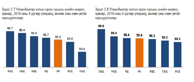 Үндэсний статистикийн хорооноос гаргасан нийгэм, эдийн засгийн тайлангаас харахад, Улаанбаатар хотын төвийн зургаан дүүрэгт орон сууцны үнийн индекс 2016 оны 4-р улиралд 2010 оны эцсээс 83,3 хувиарч өсч, өмнөх оны мөн үеэс 4.6 хувиар, өмнөх улирлаас 0.6 хувиар буурсан байна. Орон сууцны үнийн индекс өнгөрсөн оны 4-р улиралд өмнөх оны мөн үеэс Сонгинохайрхан дүүрэгт 6.6 хувь, Баянгол дүүрэгт 5.0 хувь, Чингэлтэй дүүрэгт 4.3 хувь, Баянзүрх дүүрэгт 4.1 хувь, Сүхбаатар дүүрэгт 3.6 хувь, Хан-Уул дүүрэгт 0.6 хувь, Сүхбаатар дүүрэгт 0,2 хувиар буурсан үзүүлэлттэй байна.